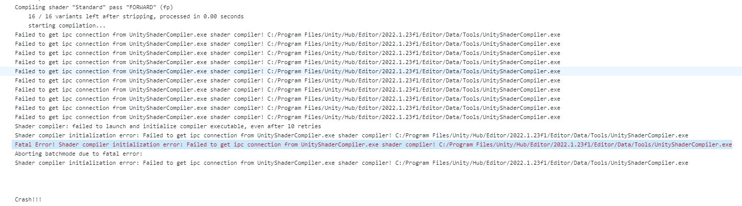 Shader compiler initialization error: Failed to get ipc connection from UnityShaderCompiler.exe shader compiler! C:/Program Files/Unity/Hub/Editor/2022.1.23f1/Editor/Data/Tools/UnityShaderCompiler.exe